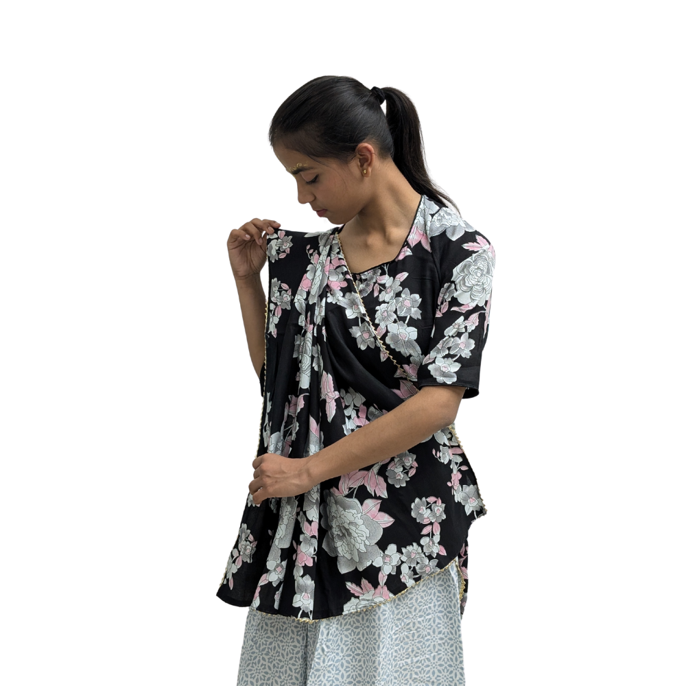 While being really lightweight and breathable. The fabric is really comfortable for all day wear long amounts of poojas, devotional dances, and religious gatherings. Black-It’s just so sober action! The subtle floral print adds a bit of feminine charm. The balance between rich color and delicate detailing makes this Gopi-style outfit haute yet very functional.