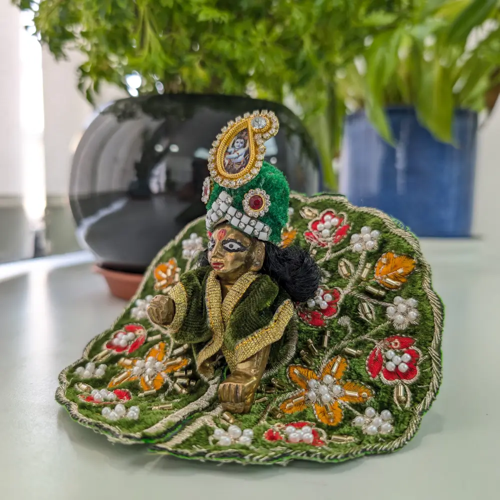 Agar aap apne Bal Gopal ke liye ek royal aur vibrant look talash rahe hain, toh yeh Green Velvet Laddu Gopal dress aapke liye perfect choice hai. Sabse pehle, yeh designer poshak premium velvet fabric se bani hai. Is wajah se, isme ek luxurious shine aur behad soft texture milta hai. Iske alawa, is poshak par heavy sequin work aur delicate pearl finishing di gayi hai jo iski khubsurti badhati hai. Yeh combination ise kisi bhi festival ya vishesh avsar ke liye ek shandaar chayan banata hai.