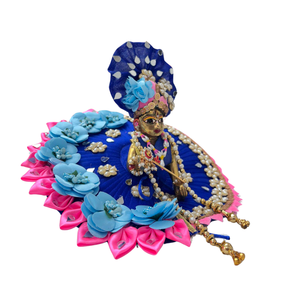 The soft and airy net fabric adds a touch of elegance to the appearance of your Laddu Gopal. With floral embellishments made from bright sky blue fabric and complemented with pink fabric leaves. The dress exudes an aesthetic of freshness and joy. Hand-made floral detailing embraces the natural charm while blending perfectly with the entire color scheme.