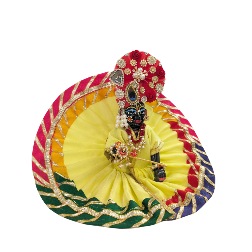Whether you’re dressing your Laddu Gopal for a festive event or everyday darshan. This yellow cotton poshak with multicolor gotta work offers a balance of simplicity and splendor. It’s not just an outfit, it’s a heartfelt offering that reflects your dedication and reverence.