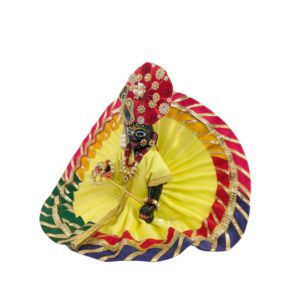 A bold, contrasting Mukut adds a regal touch and perfectly complements the colorful gotta border. Enhancing the divine charm of your Laddu Gopal.