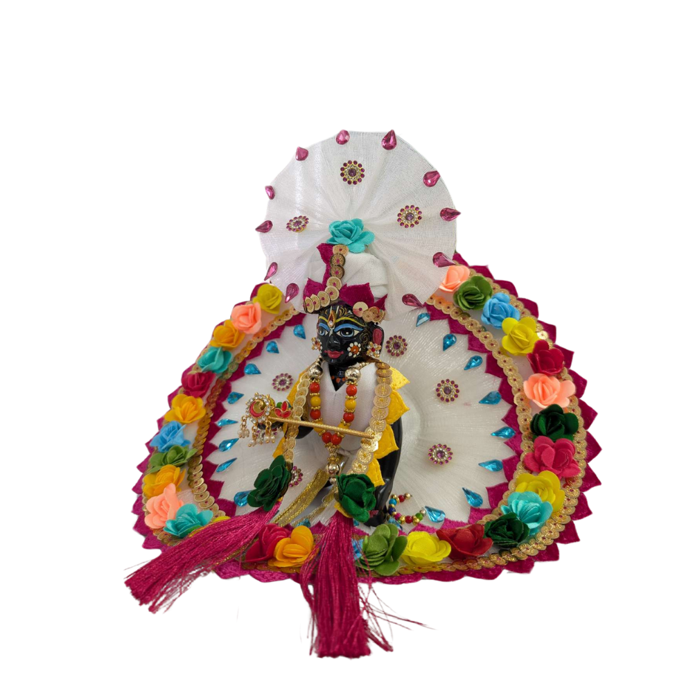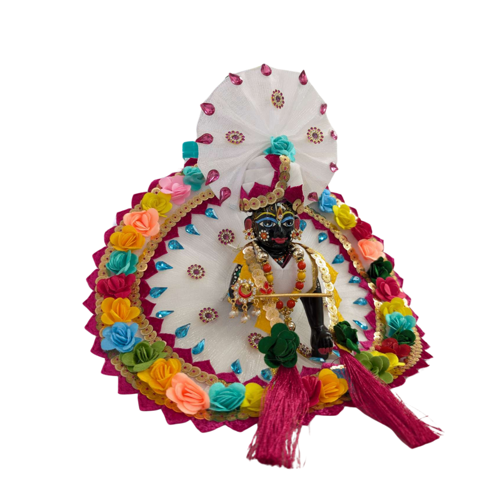A soft airy net fabric drapes your laddu Gopal with an ethereal charm that lends him a radiant angel-like appearance. The outfit is beautifully adorned with colorful flowers that give life and dynamism to the whole ensemble. Each of the flowers made from different bright fabrics add their color, giving a good balance between traditional and creative.