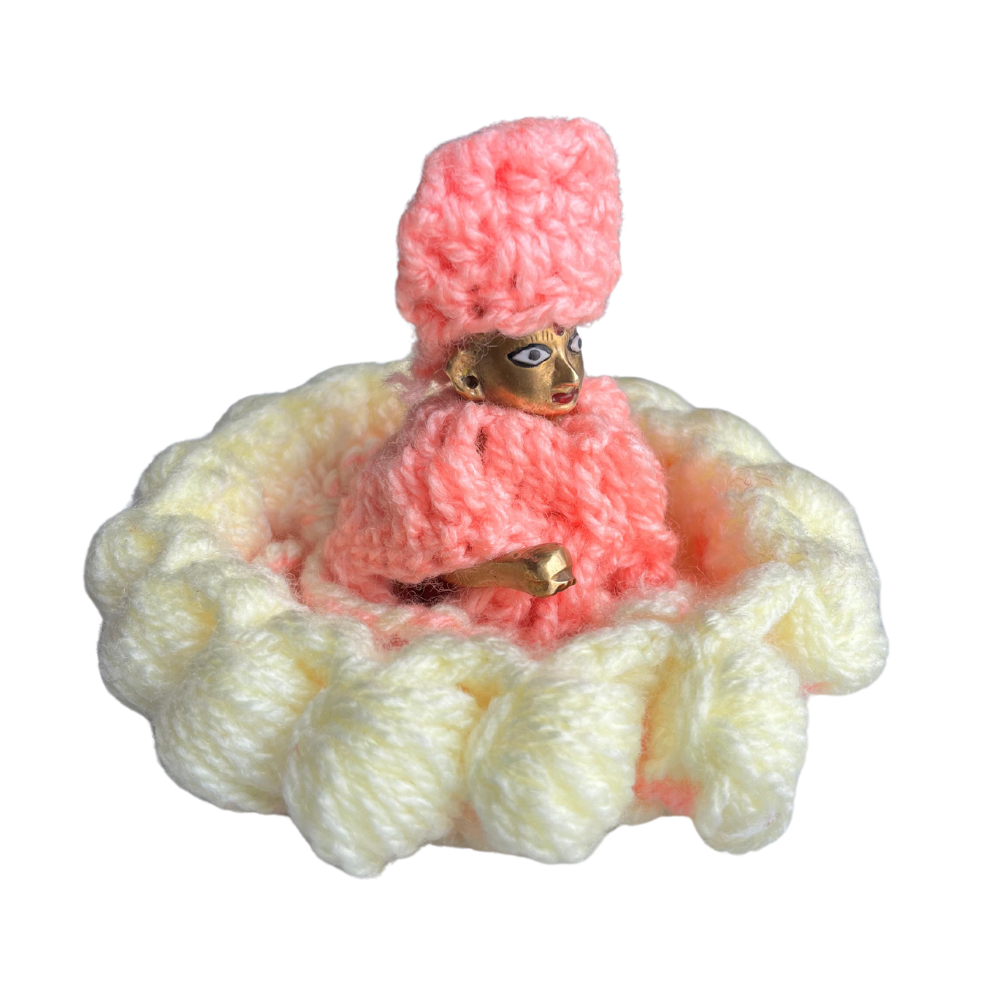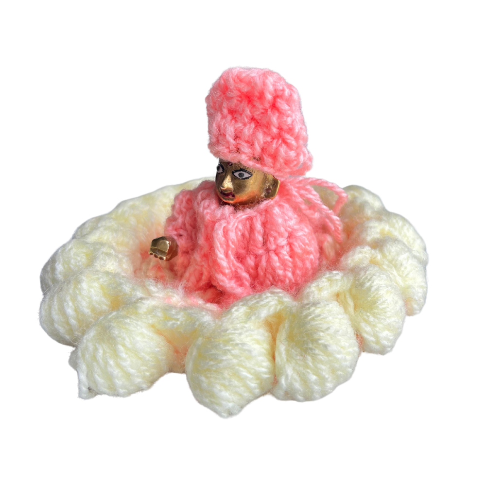 Bring home this pink and yellow winter dress with a cap for Laddu Gopal to shine in comfort and splendid style. So very much more than a dress, it is a statement about you and your bhakti and a necessary winter-wear addition to the idol’s closet.