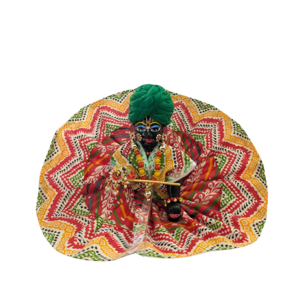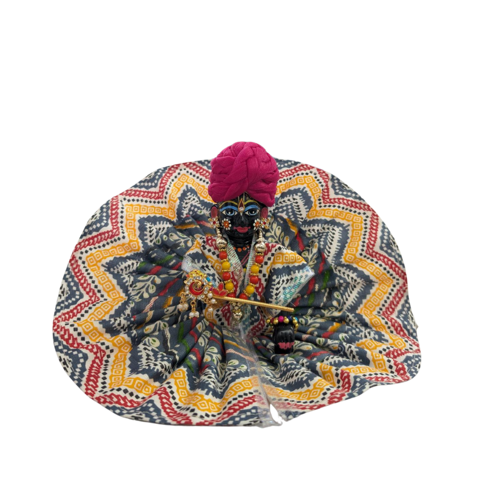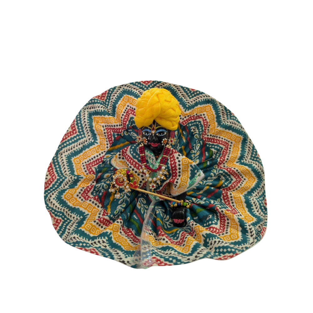The reason this dress stands out from the rest is its colorful prints that adorn the entire outfit. The lively patterns, splashes of color, and intricate prints encapsulate the spirit of Bal Gopal’s happy and playful nature, yet maintain a touch of classical tradition. These bright colors and patterns celebrate devotion with a cheerful jive, sprucing up the ambience at your home shrine.