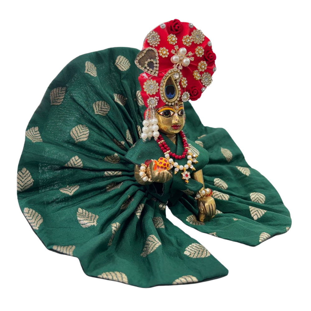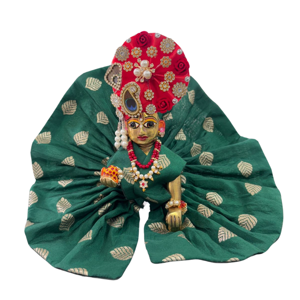 The other half of the divine outfit would be to pair it with a laddu gopal designer mukut in a contrast color. Providing a very bold focal point for the outfit and consequently lifting the whole appearance. The elegance of this green silk dress, coupled with the striking contrast of the mukut. Forms a striking dichotomy, one that will immensely attract admiring glances on any spiritual occasion.