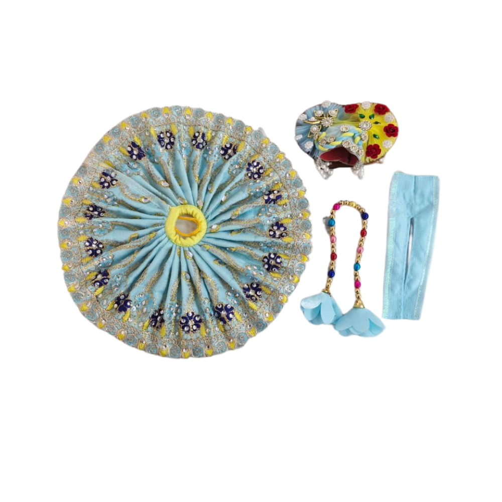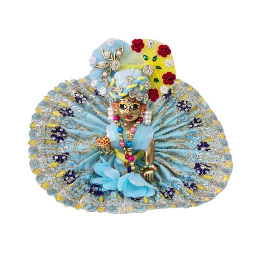 This Laddu Gopal Kolkata-style dress, which with a blue backdrop enriched with heavy work, accentuates the charm of your Laddu Gopal. This traditional poshak, with its delicately designed details and high-quality fabric, is an excellent choice to adorn your deity on special occasions, festivals, and every day. The color blue represents calmness and divine grace, while the heavy embroidery and embellishments give it a royal touch. The Laddu Gopal Blue Poshak, with beadwork, sequins, and intricate embroidery, is a fine example of Kolkata heritage in art and craft.