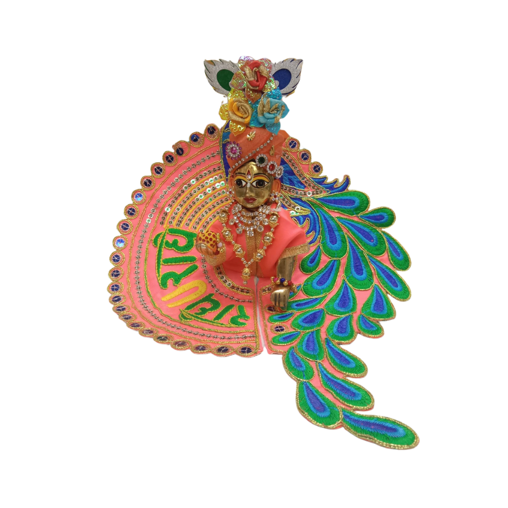 We crafted this wonderful Kanha Ji designer dress in a beautiful peach shade exclusively for Laddu Gopal size 1 to enhance your deity’s divine beauty. Inspired by the kingly elegance of Lord Krishna, we designed this piece in a graceful peacock style to give your deity a vibrant and spiritual touch.