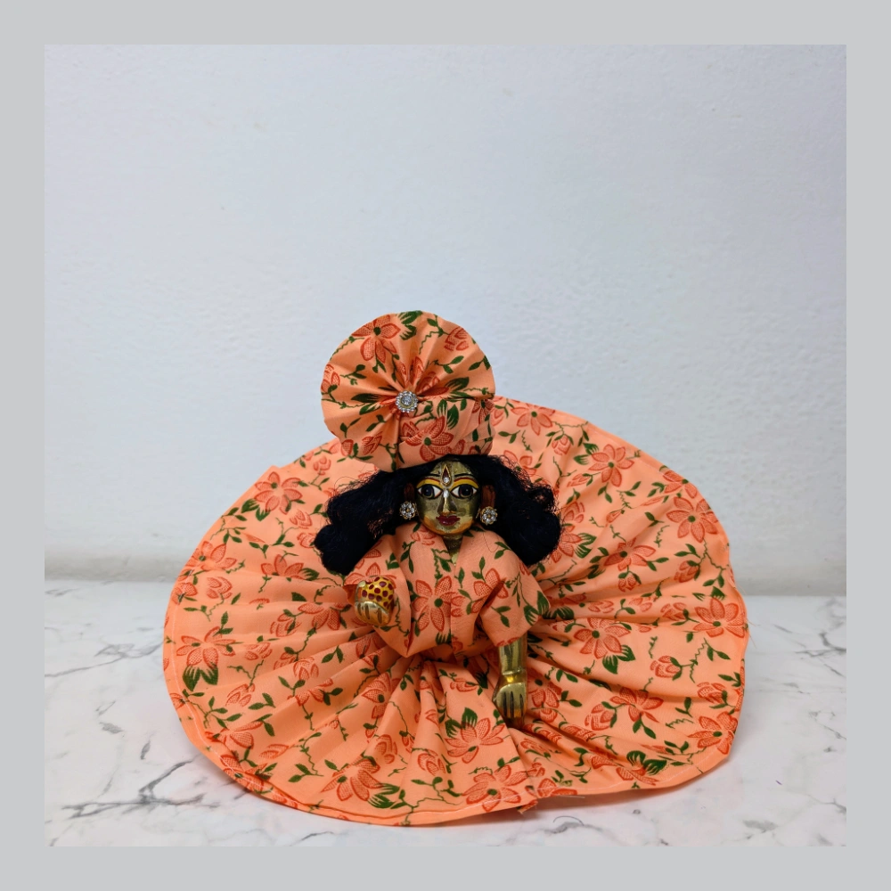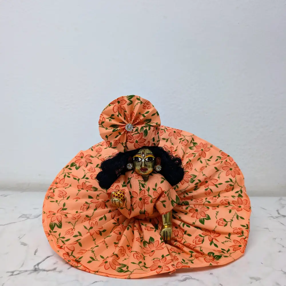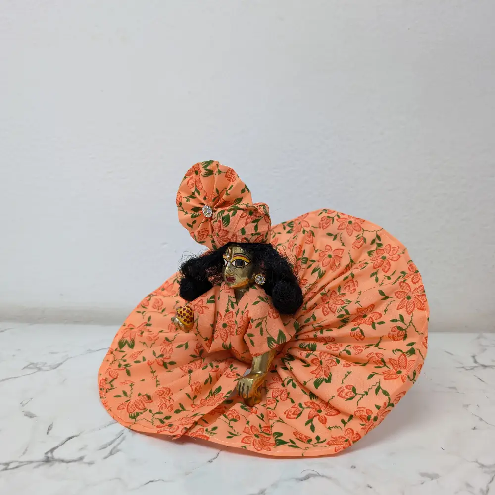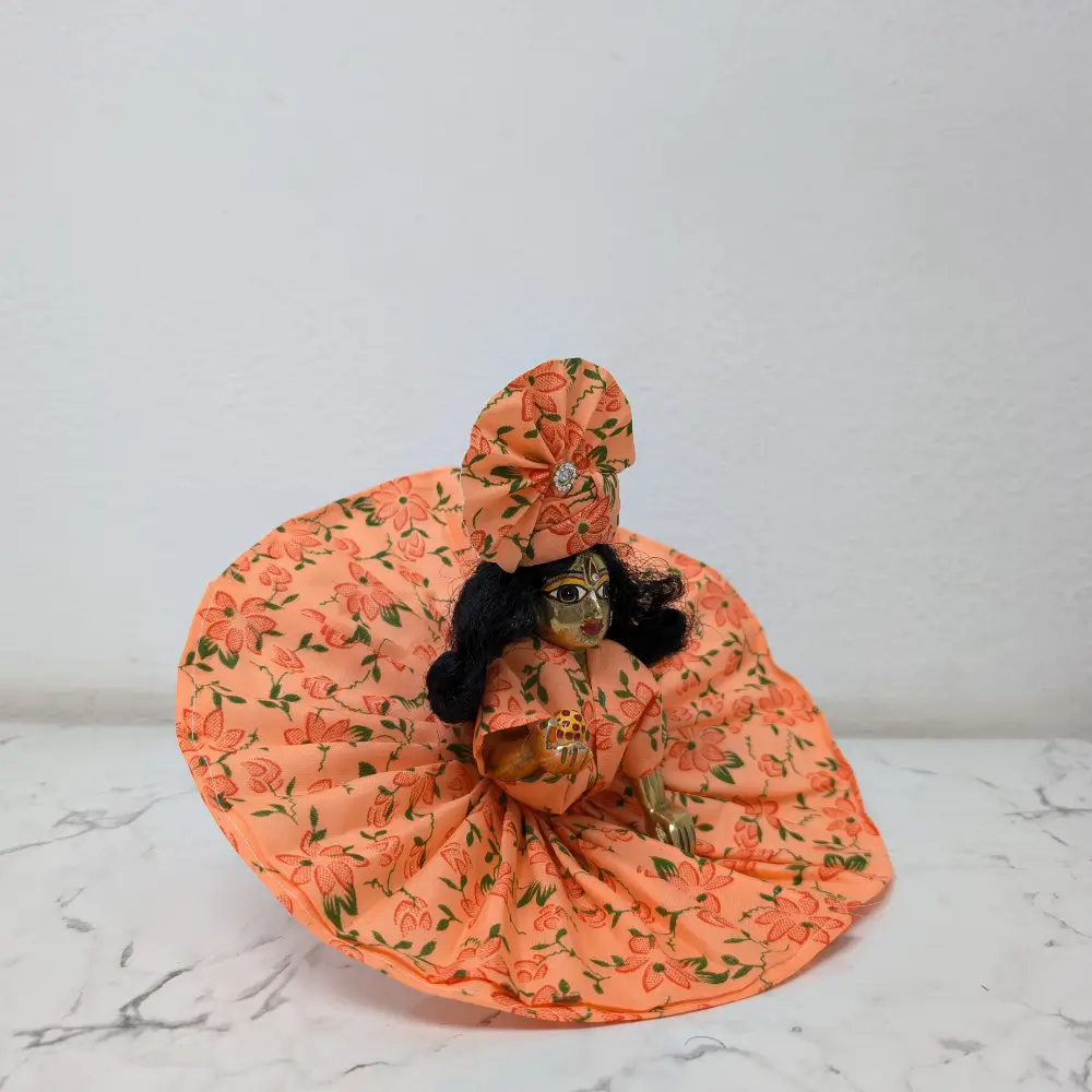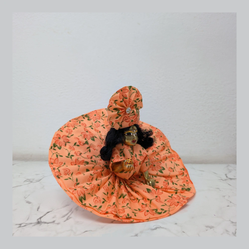 Are you looking for a super comfortable and beautiful outfit for your Laddu Gopal Ji? Our Laddu Gopal Summer Dress is specially made from pure and soft cotton fabric. This high-quality material ensures your Kanha Ji stays cool and relaxed even in the heavy summer heat. This bright orange Poshak comes with a lovely red floral print, making it look very attractive and traditional for your home mandir.