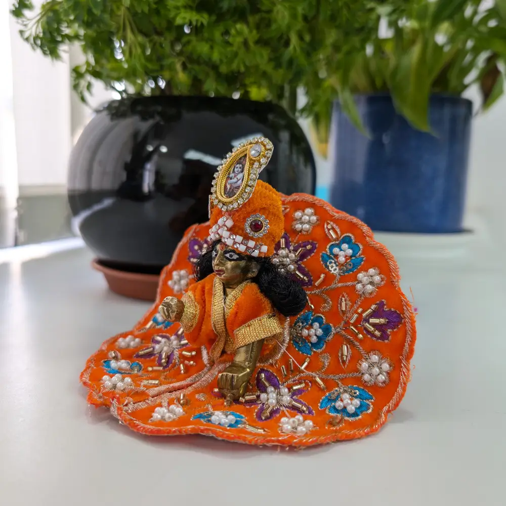 Har bhakt ki iccha hoti hai ki unke Kanha ji sabse sundar aur alag dikhein. Isliye, humne is poshak ko pehnane mein behad aasaan aur comfortable banaya hai. Iska vibrant orange colour pavitrata aur shakti ka prateek mana jata hai. Parinamswarup, yeh aapke mandir ki shobha ko pehle se dugna kar dega. Is designer dress ka ghera (flair) kafi heavy hai, jo Thakur ji ko ek paripoorna aur shahi swaroop pradan karta hai.