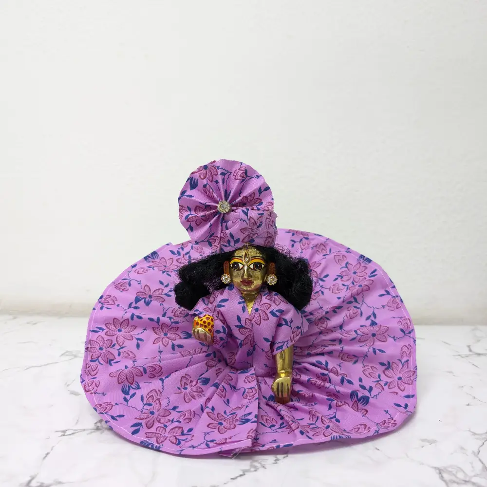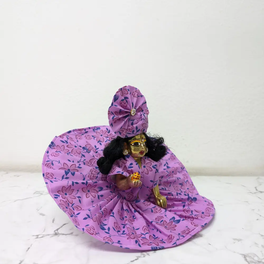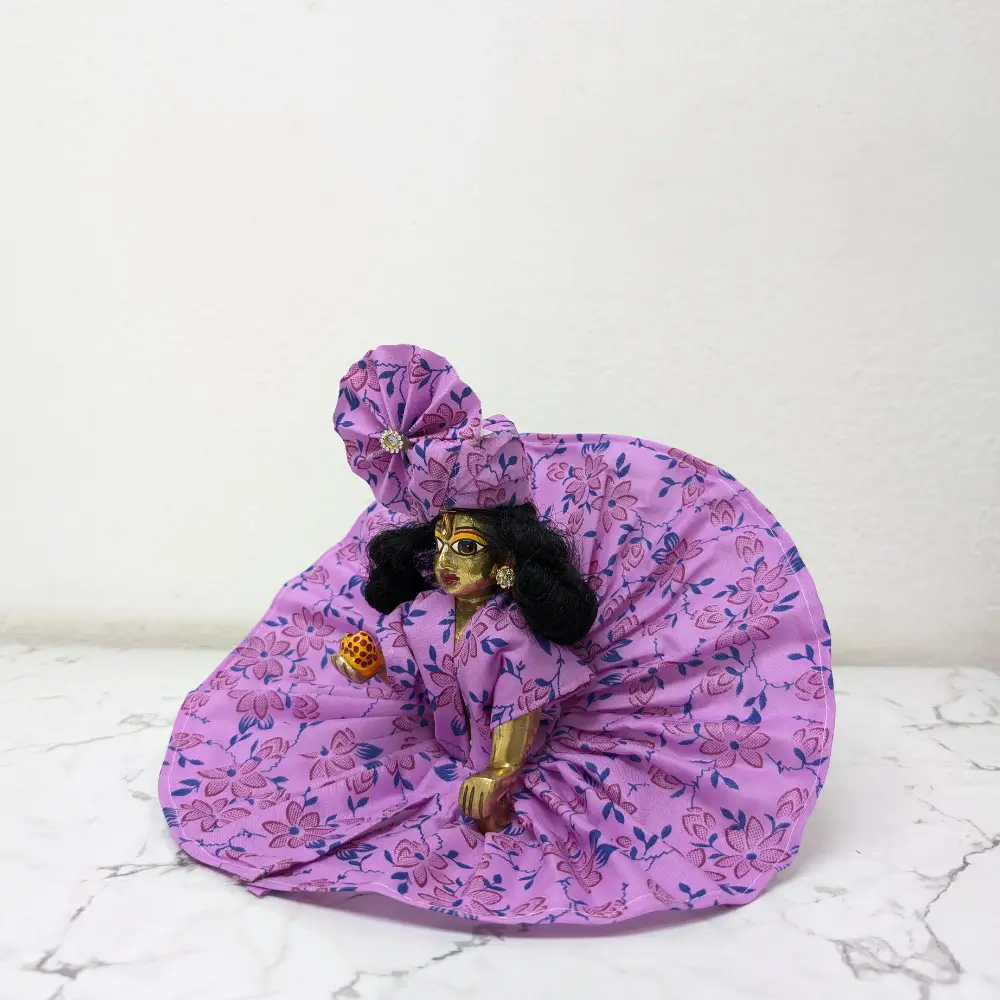 Are you looking for a super comfortable and beautiful outfit for your Laddu Gopal Ji? Our Laddu Gopal Summer Dress is specially made from pure and soft cotton fabric. This high-quality material ensures your Kanha Ji stays cool and relaxed even in the heavy summer heat. This bright purple Poshak comes with a lovely red floral print, making it look very attractive and traditional for your home mandir.