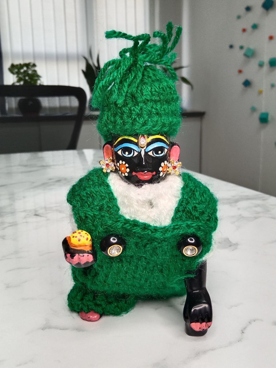 A serene setting with Laddu Gopal Ji glowing in the green jumpsuit.
